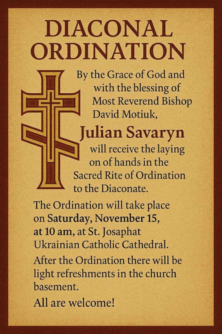 Наш семінарист піддиякон Юліян Саварин буде висвячений на диякона15-го листопада, о 10-тій годині ранку, в Катедрі Святого Йосафата. Всіпарафіяни запрошені на цю подію. АКСІОС!