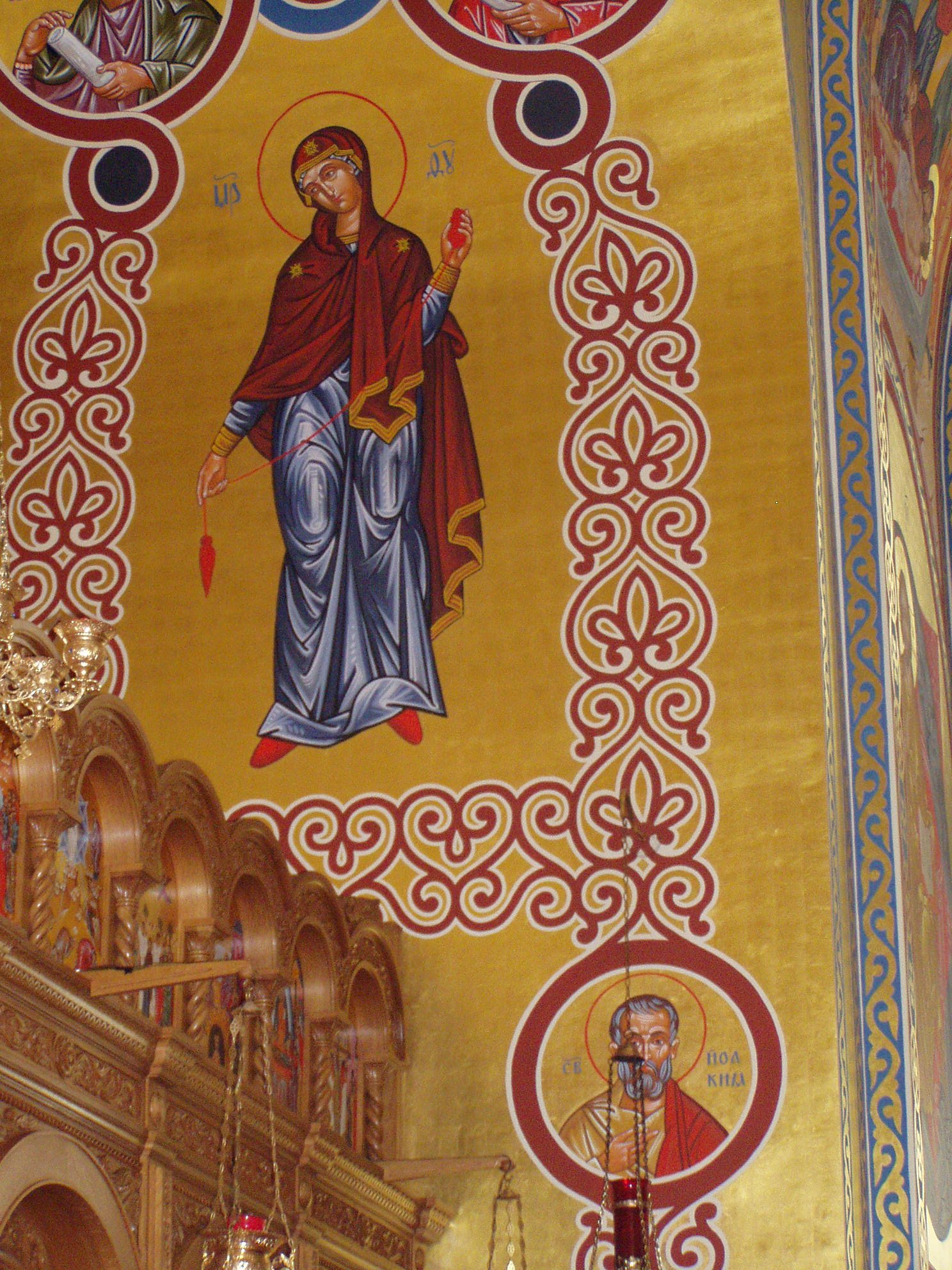 Коли прийшлося вибирати святих, яких зображено на стінах, підшукано, крім очевидячки важливих святих, тих, яких імена носить більше число парафіян; важливіших святих намальовано у вищому ряді. У кругах над вікнами є ікони преподобних печерських: Агапит Цілитель (ST5), Аліпій Іконописець (ST4), Нестор Літописець (ST3) та преподобний Теодор Студит на півдні, а на такий самий лад мучениці Віра (NT2), Надія (NT3), Любов (NT4) та Галина на півночі. Під ними (на півдні) цілителі-безсрібники Кузьма, Дем’ян та Пантелеймон, преподобний Роман Солодкоспівець, святитель Богдан (Теодот), священомученик Йосафат архиєпископ Полоцький та преподобний Іов ігумен Почаївський. Напроти них з північної сторони є мучениці Катерина, Варвара, Текла, Софія, Параскева, Христина та Ірина. Перших п’ять поіменно поминають у деяких редакціях Проскомидії.