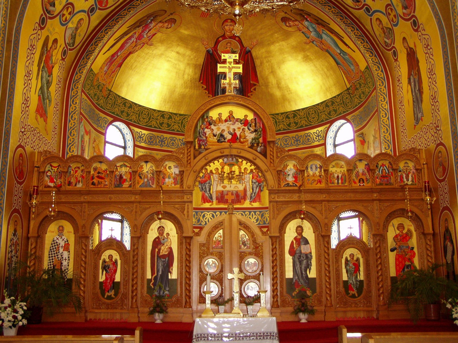 Вівтар злучений з храмом дугою, на якій намальовано чотирьох великих (Ісая, Єремія, Єзекіїл і Даниїл) та дванадцятьох малих пророків (Амос, Софонія, Михей, Авакум, Наум, Йона, Ілля, Малахія, Йоіл, Захарія, Огій та Осія; замість Овдії намальовано Іллю, бо його зокрема святкують українці й багато носять його ім’я). (A17) (A15) Під пророками є Благовіщення (A21) (A22) (за зразком мозаїки в Соборі святої Софії в Києві), а під ним Богоотці Яким і Ганна. Продовженням намісних ікон іконостасу, але під прямим кутом до нього є апостоли слов’ян Кирило (A4) (з глаголичною азбукою) та Методій (в єпископських ризах) (A5). Лицем до вірних на самій горі дуги є композиція «Деісус» — Спаситель між Богородицею та пророком Іваном Хрестителем (знов за зразком київської святої Софії) (Pe8).